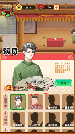 2、解锁新的艺人,登场进行演出,吸引客人就座听相声,升级茶馆获得更多道具。