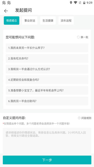 2、目前主要的问题可分为情感婚恋、事业财运、生活健康、流年运程,下划到自定义提问内容。