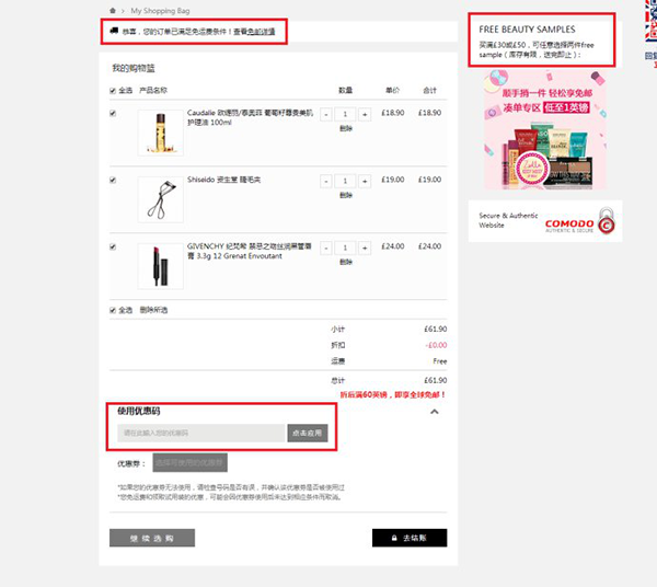 - 购物车右侧还有一些满额(£30或£50)即可免费领取的小样, 点击即可加入购物车(小样数量有限,如果没有可以勾选的小样即表示已派送完了)