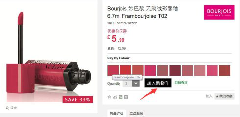 4、对于有色号等选项的产品,点击单品进入详情页,选择喜欢的颜色和需要的数量后,加入购物车。