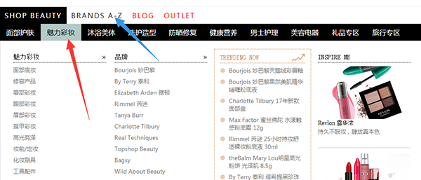 - 蓝箭头所指:按A-Z字母排序的各大美妆品牌,点击可以查看全部