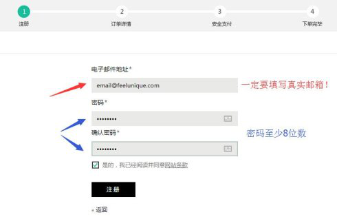 - 用户名:填写一个邮箱地址,这个邮箱一旦注册好就不能修改,所以一定要用自己的真实邮箱,便于以后接收发货通知等重要邮件;