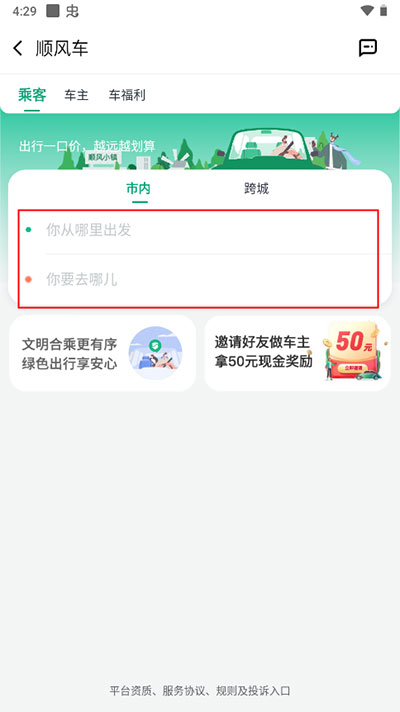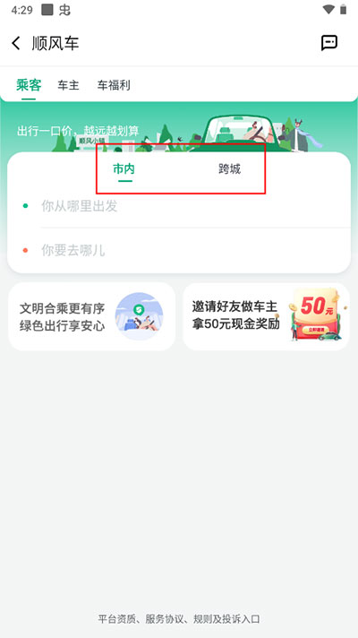 2、然后根据自己的出发地与终点选择市内或跨城顺风车。