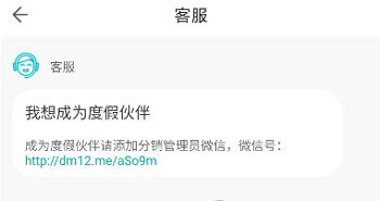 2、选择【度假伙伴】,自动进入客服页面,点击链接跳转到分销管理员微信,添加微信号申请成为度假伙伴,即可获得相应佣金。