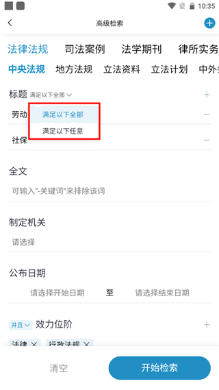 同一检索条件下的多个条件可以选择“满足以下任意”或“满足一下全部”