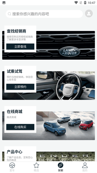 4、点开搜索,内容中有查找经销商、试乘试驾、在线商城等功能,你可以在这里找到最近的经销商也可以在这里进行预约试驾甚至这里还可以线上看车。