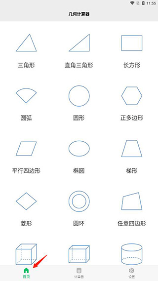 1、下载打开软件,在首页可以看到有各种几何图形,比如三角形、直角三角形、长方形、圆形、梯形、圆环等等;