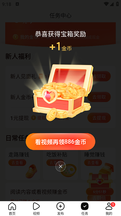 最后,刷完视频之后,红包滚动条变满,就会获得金币,通过提现金币就可以赚钱了