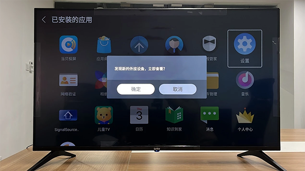 4、成功开启后,将U盘插到电视上,会弹窗提示发现外接设备,选择【确定】进入查看;
