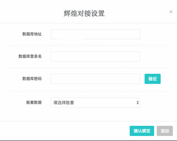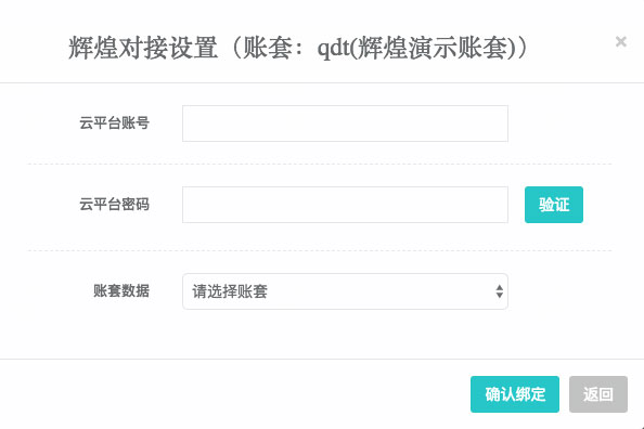 填完信息后点击验证,会获取到帐套列表,然后选择需要绑定的帐套名称,最后点击确认绑定,完成对接。