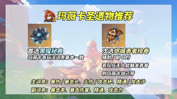 【圣遗物推荐】黑曜秘典,15%站场增伤、40%暴击率,实在太强。若是充当副C且队伍无角色能携带烬城勇者绘卷,则玛薇卡自己带。※主词条:暴伤/暴击头、火伤/攻击杯、精通/攻击沙;副词条:暴击率、暴击伤害、精通、攻击力。