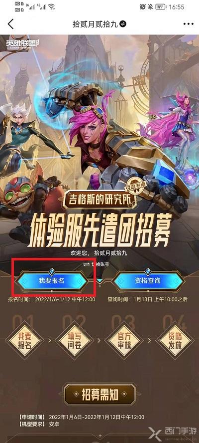 3、点击后进入LOL手游体验服申请界面,在这里点击【我要报名】选项,然后填写问卷提交,之后等待名单出来之后点击“资格查询”即可。