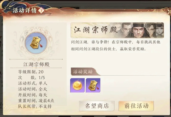 江湖宗师殿是天龙八部2手游中的单人挑战玩法,类似单人竞技场的玩法。