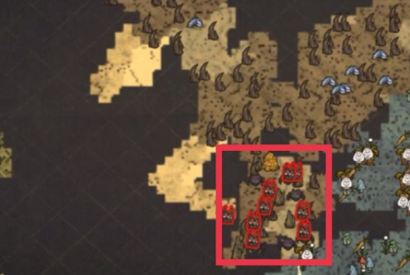 2、二层洞穴的入口通常在离一层洞穴入口不远的地方,而且一定会有以下特征:在遍布矿石的土黄色地皮上面。周围一定被蜘蛛围绕。兔人和石头龙虾也住在旁边。