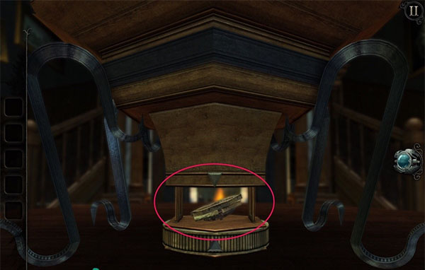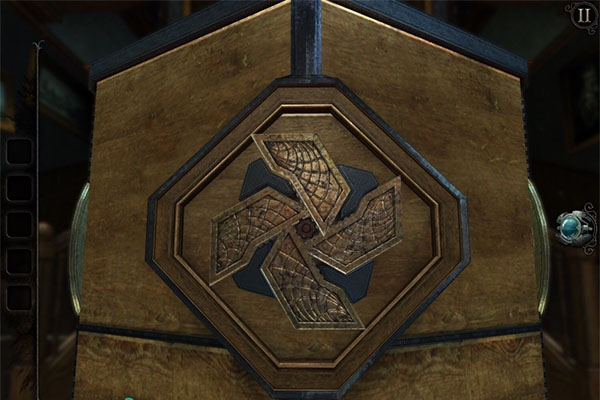 11、回到大厅。像上次那样打开机械硬币。把它放到机关盒的另外一个卡槽里,找到与所示轮廓相吻合的图案。得到一个雕花的金属板。