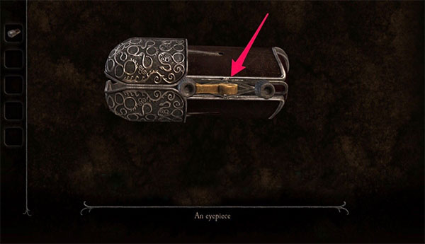 4、回到手提箱。检查侧面。向下滑动手柄,会出现隐藏的隔间。得到目镜。在物品栏中查看目镜,在侧面找到金属条。转动金属条,激活目镜。
