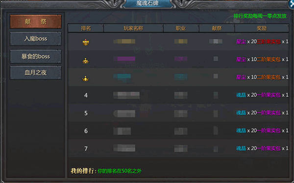 入魔boss排行:玩家通过击杀入魔boss,根据boss数量奖励藏品宝箱;