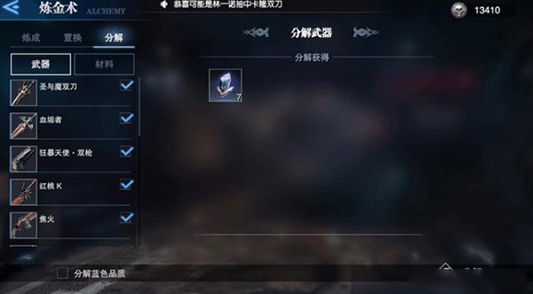 抽到重复的武器自动分解,不需要的武器可以在炼金术中进行分解。