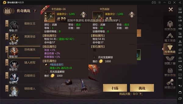 由此可以看出传奇怪物之间的等级跨度还是很大的,后期甚至要30级才会有新的BOSS! 而且由于传奇挑战每天只有三次挑战的机会,所以奉劝大家在准备妥当之后再去挑战,不要浪费了这个获取强力装备的大好机会。