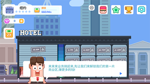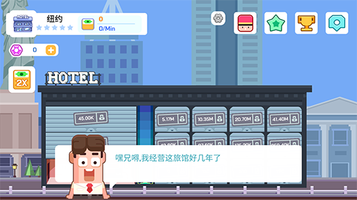 连锁酒店大亨是一款以酒店为题材经营手游,游戏集中玩家将扮演一位旅馆的老板,从开放第一间客房开始,逐步开放更多的房间,用以提升旅馆的服务质量以及住宿环境,提升酒店知名度,再视情况发展扩大业务,打造出属于自己的商业帝国。游戏采用挂机经营模式,不肝不氪,玩家只需要在空闲时间上线领取对应奖励并制定下一步计划即可,轻轻松松当老板。感兴趣的用户欢迎在本站下载试玩!
