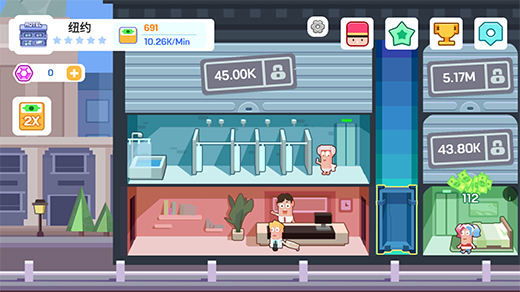 玩的时候,我会觉得这个游戏真的超级棒!一开始从接待第一个客人开始,看着客人每十秒付钱,那种小确幸的感觉特别让人开心。升级房间能赚更多钱,但只靠开房间赚钱太慢了,商业区的加入让玩法更丰富。比如澡堂就是我解锁的第一个商业区,收入很快就上去了!画面和音乐也很加分,每次打开游戏都有一种身临其境的感觉。