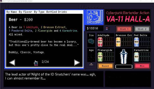 调配框:屏幕右侧为调配框,当中会显示五种调酒材料(adaelhyde、bronson ext、pwd delta、flanergide.karmotrine) 、两种添加物(冰块、age) 、两个槽(1槽、2槽)以及两个操作键(重置和混合)。特别注意操作键"混合",初期混合是属于轻度摇晃,当5秒钟过后则会变成快速摇晃,某些饮品属于轻度摇晃的,则不能快速摇晃。