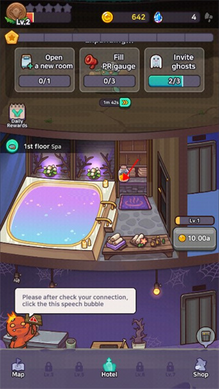 幽灵酒店(Idle Ghost Hotel)是一款画风非常Q萌可爱的休闲放置游戏,真实的物理机制,独特的游戏内容在加上全新的背景音乐,可以让玩家放松心情,体验到更多快乐。游戏中你将化身成为幽灵酒店的经营者,在这里发展自己的商业模式,制作各种食谱来满足不同顾客的需求,举办一些非常娱乐的活动,完成一系列的挑战,打造自己的高端酒店。其中有着各种各样的道具,不同的道具有着不同的功能和作用,你可以使用它来满足客人的一切需求。随着酒店的经营越来越好,你还能对酒店进行升级,雇佣各种各样可爱的小幽灵,将它们安排在不同的岗位之中,让它们都有自己的工作可忙。此外,在幽灵酒店游戏中还设置了多变的场景内容,包含各种有意思的随机事件,每次触碰都可以引发不同的效果哦。喜欢的小伙伴快来下载体验吧!