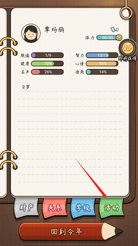 7、另外,当没有事件弹出来的时候,玩家可以直接点击【结束今年】或者点击下方的事情直接添加上去;比如说在9岁的时候,游戏没有弹出事件,我们可以点击下方的【活动】。