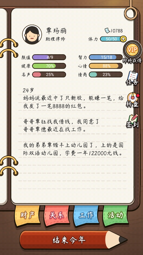 3、游戏中的决策会对你的人生产生影响,包括财富、健康、亲人好友等多个方面;