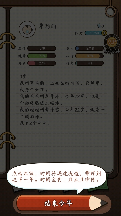 1、首先,玩家在本站下载并安装好游戏之后,打开进入,进入后,主角覃玛丽刚出生,因此直接点击【结束今年】;