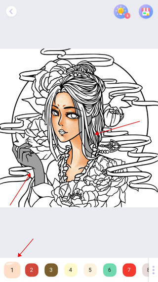 3、点击下方数字,色彩对应的地方会呈现出阴影,再点击阴影部分即可上色。