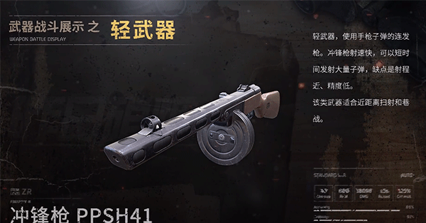 轻武器,使用手枪子弹的连发枪。冲锋枪射速快,可以短时间发射大量子弹,缺点是射程近、精度低。