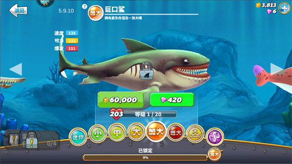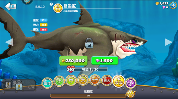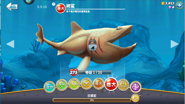 6、超大级鲨鱼:有大白,狂暴群鲨。吞噬鲸鱼之类的大型猎物。可吞食绿水母。狂暴群鲨可以吃所有鲨鱼。可以同时装备三只宠物,在淘金热时获得7倍的点数。