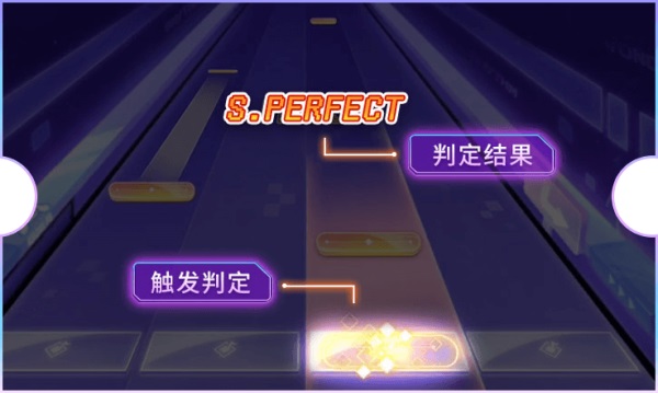3.音符判定结果分为5种:s.perfect、perfect、great、cool、miss,根据手指接触指定判定区时间及区间进行判定。