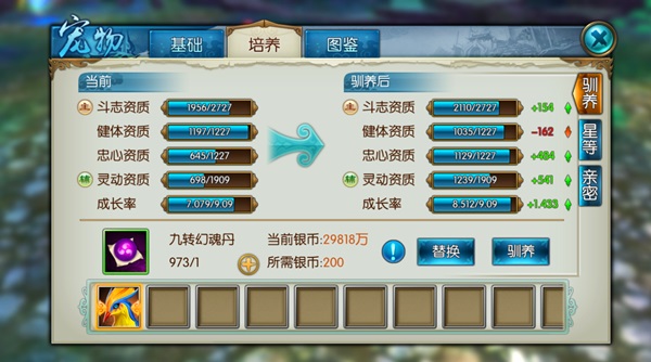 培养功能中有三项:驯养,星等,亲密。这些是对宠物的道法提升更加重要的功能。