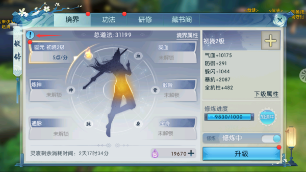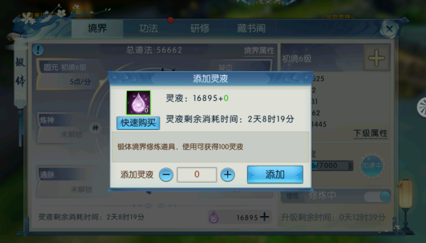 特别提醒:游戏大更或者开启锻体后,优先解锁境界,添加灵液,锻体细节需要时间积累,尤其高V需要加速修炼,早点提升就能早点解锁更多境界,装备更多功法,解锁功法属性和神通。