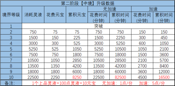 这个图表是每个境界解锁的数据,结合前面的升级数据,可以得出:
