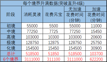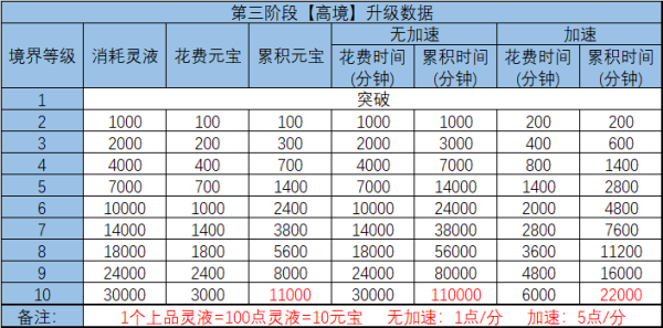 对比上面两个表格和分析,加速比不加速要缩短五分之四的时间,同时花费也极大幅度提升。当然,实际上如果选择只同时修炼部分境界,只加速一部分的话,总体的元宝花费和时间都还能接受。具体自己也可以计算。