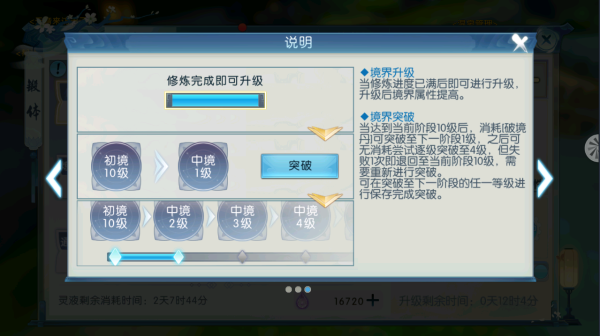 每个阶段有10个等级,提升等级可以提升境界属性。