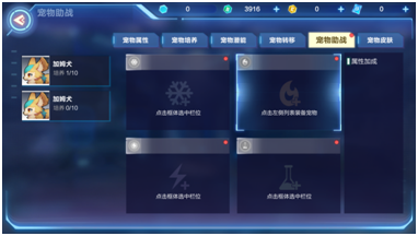 宠物助战是一个非常具有策略性的玩法,玩家可以选择对应属性的宠物放到栏位中,对应属性的宠物才可以激活技能,否则只能获得助战属性。