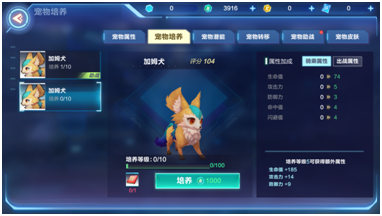 对宠物的培养可以提升宠物的骑乘属性和出战属性,宠物的培养等级上限会随着宠物自身的等级段提升而增加。