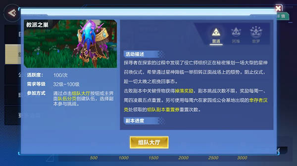 活动副本参与方式:通过组队页面或者活动页面进入,可以组队进入也可以单人进入,拥有强大的团体可以使效率提高,难度太高,建议满配阵容进入。