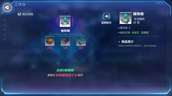 储物箱,需要材料:木材215,星灯木9,能量水晶39级解锁。玩家前期必备物品之一,由于背包物品栏的限制,储物箱便成了最终之选。多余的材料,物品可以通过回到家园储存在储物箱中,需要制作物品装备的时候直接拿取即可,也可为角色减轻负重。能量水晶可以在地图中各处获取。
