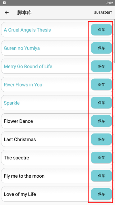 4、选择想要演奏的乐曲并点击后方的保存选项来保存脚本