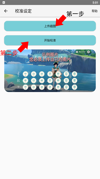2、接着按照示例图片进入游戏来上传截图,并点击开始校准来完成游戏校准工作
