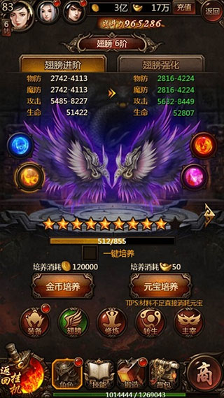 2、翅膀可以为人物提供属性加成,通过培养、升级翼窍、强化这三种方式可以进一步提升属性;其中培养需要消耗羽毛,玩家可以通过挑战羽毛副本获得,又或者使用金币或元宝代替羽毛;