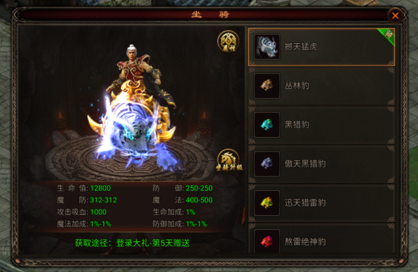 撼天猛虎(登录大礼-第5天赠送)、丛林豹(福利大厅-每日礼包获取)、黑猎豹(由丛林豹合成)、傲天黑猎豹(由黑猎豹合成)、迅天猎雷豹(由傲天黑猎豹合成)、熬雷绝神豹(由迅天猎雷豹合成)、邪影银月狼(由熬雷绝神豹合成)、赤影银月狼(由邪影银月狼合成)、血影银月狼(由赤影银月狼合成)