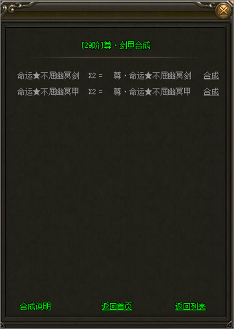在装备合成中,玩家可以将相同阶级的2件装备放在背包中进行合成,可合成的最低装备等级需要29阶以上的武器、盔甲,33阶以上首饰装备。