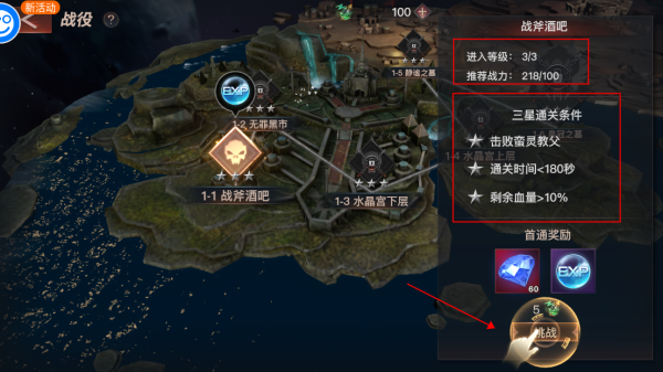 2、会出现通过该关卡推荐的战力、以及获取星星的条件,点击挑战即可进入游戏