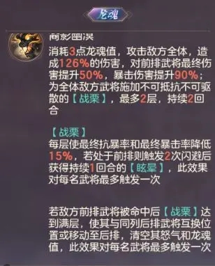 重溟张飞:开创了格挡率,同时也开创了龙魂技换位清空怒气及龙魂值,个人心目中,他是第一个超模的魂将,自身坦度高的看不懂的情况下,3火及5火提供了大量的增伤向加成,尤其是蜀国卡。在蜀国队中,重溟张飞对关银屏、苍澜关羽等核心输出位的增益是不可或缺的。而自身龙魂技的换位清槽,也是对战中,蜀队扭转战局的奇兵。